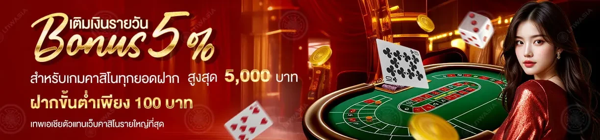 โบนัสเติมเงินรายวัน 5% เฉพาะเกมคาสิโนออนไลน์ ฝากขั้นต่ำเพียง 1000 บาท